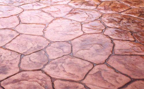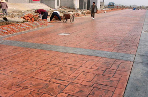 砼表面拉毛處理→撒布彩色強(qiáng)化料材料→找平收光強(qiáng)化料材料面層→撒布脫模粉→用模具壓制圖案→實(shí)現(xiàn)各種設(shè)計(jì)款式、紋理和色彩。