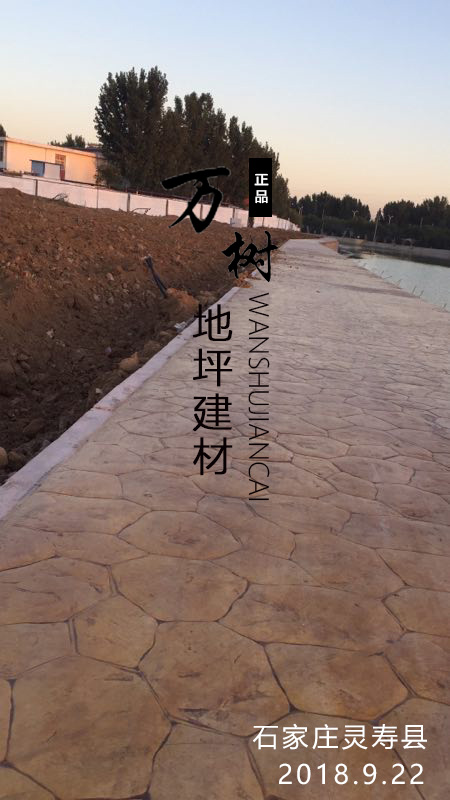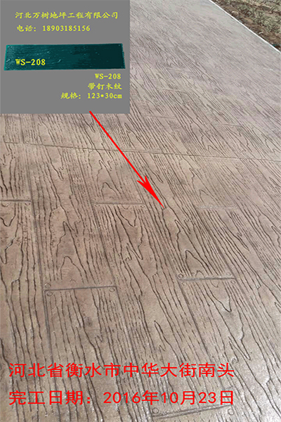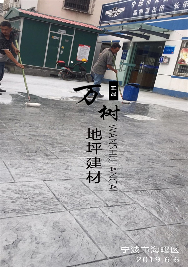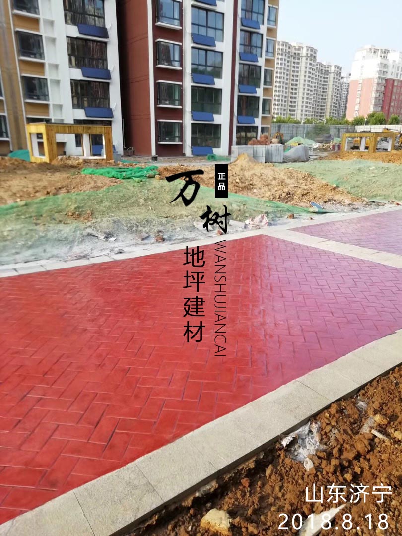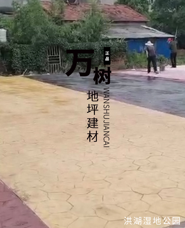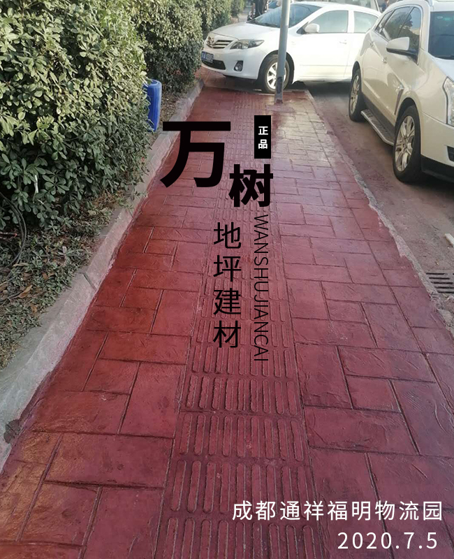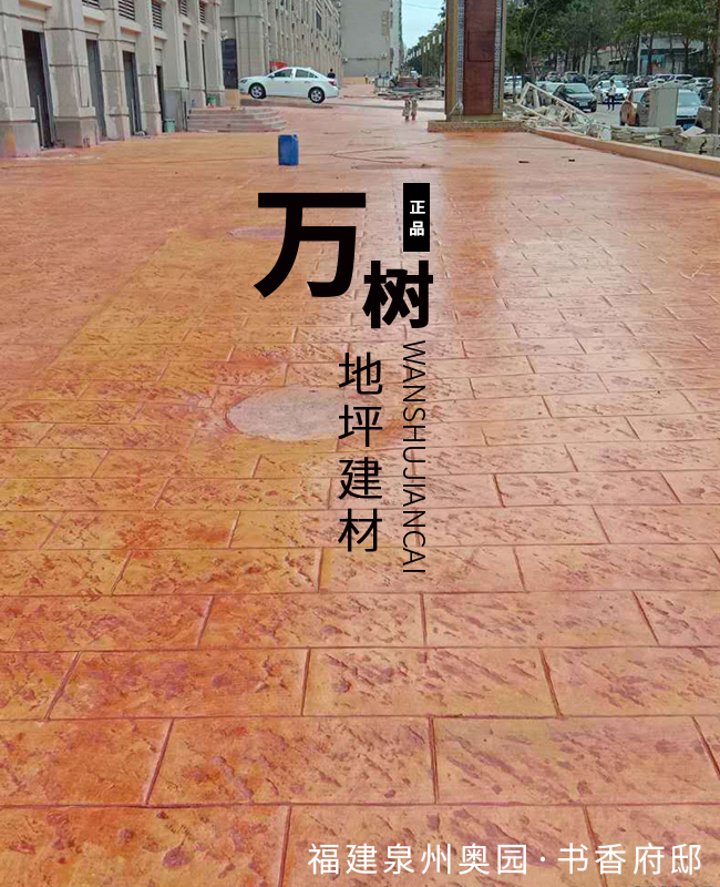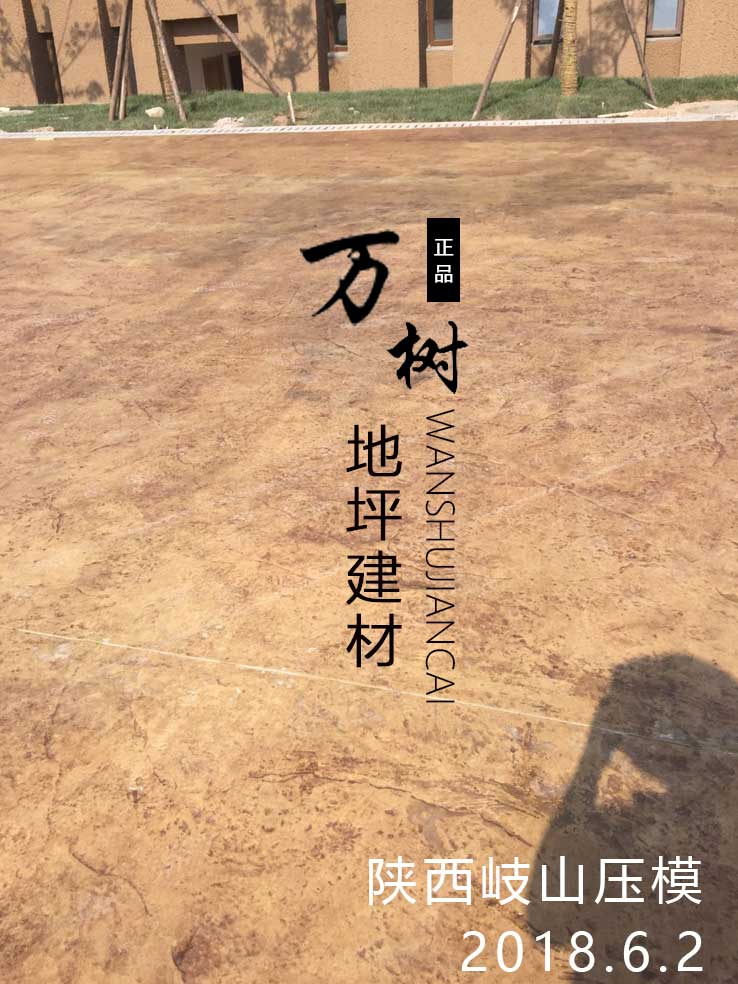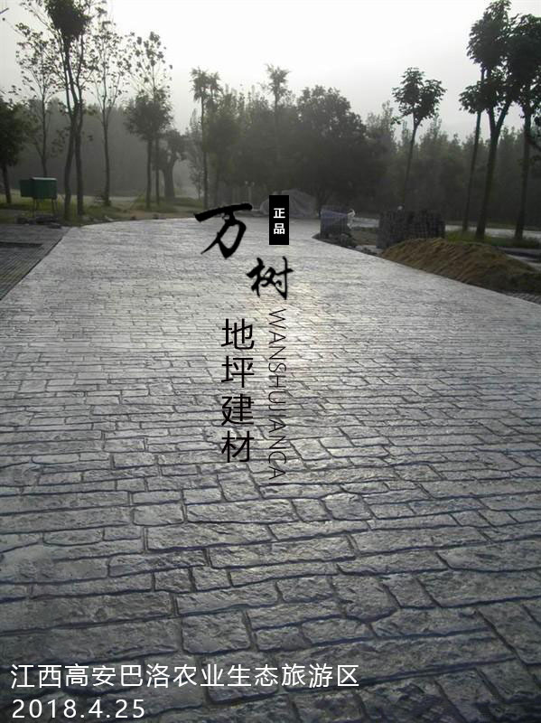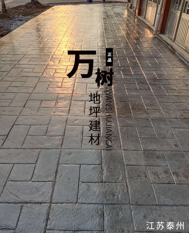 5,模具壓制圖案:用具有凹凸紋理的專(zhuān)用模具在萬(wàn)樹(shù)壓模地坪表面進(jìn)行緊密規(guī)律地拼接排放,注意保持模具固定平整,再進(jìn)行壓印,壓制圖案要一次成型不能重壓。使模具陷入混凝土中,陷入的深度與模具和施工人員使用的力度有關(guān)。施工經(jīng)驗(yàn)豐富的技術(shù)工人能使壓印的紋理均勻,深淺一致,表面的紋理凹凸有致,效果逼真。
