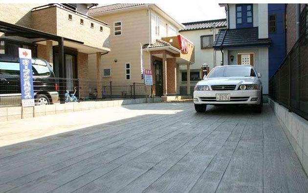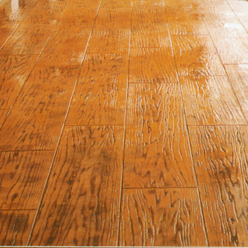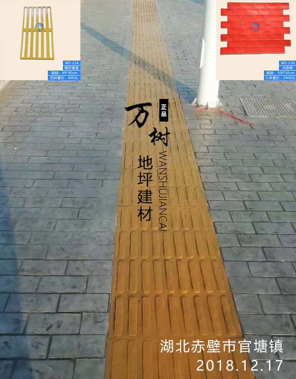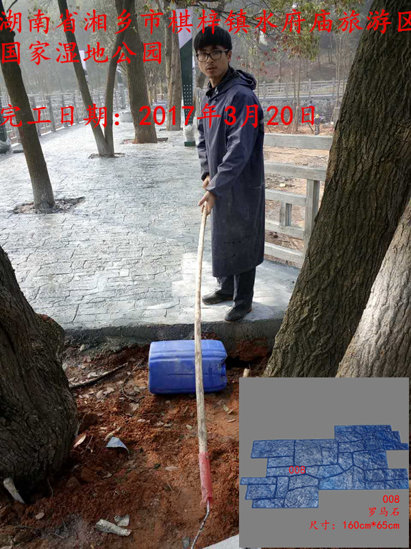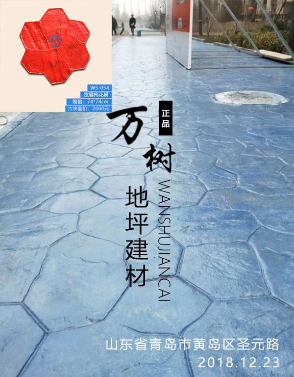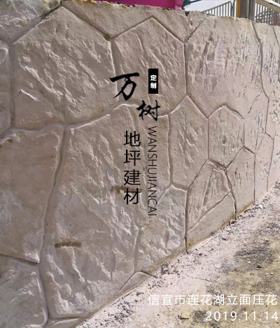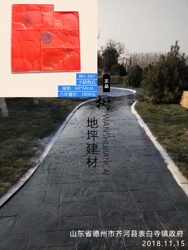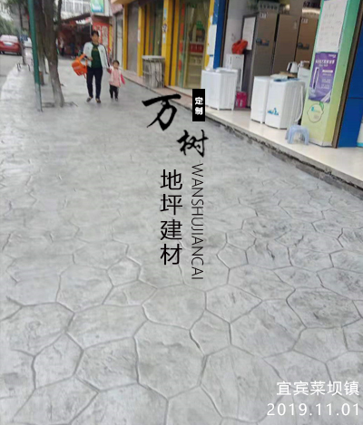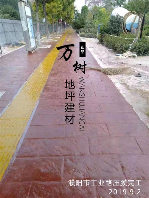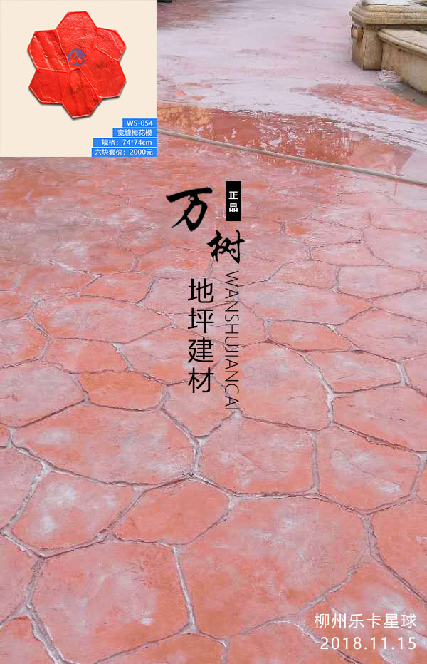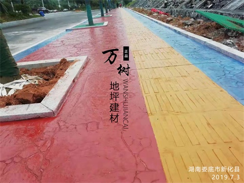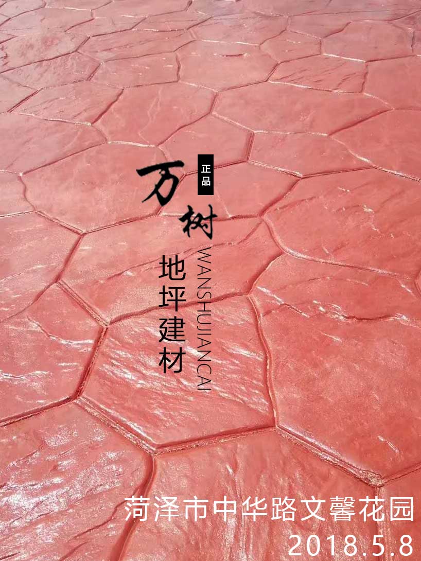 5,模具壓制圖案:用具有凹凸紋理的專(zhuān)用模具在萬(wàn)樹(shù)壓模地坪表面進(jìn)行緊密規(guī)律地拼接排放,注意保持模具固定平整,再進(jìn)行壓印,壓制圖案要一次成型不能重壓。使模具陷入混凝土中,陷入的深度與模具和施工人員使用的力度有關(guān)。施工經(jīng)驗(yàn)豐富的技術(shù)工人能使壓印的紋理均勻,深淺一致,表面的紋理凹凸有致,效果逼真。