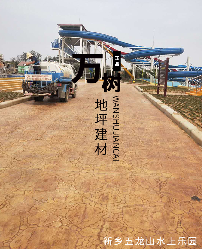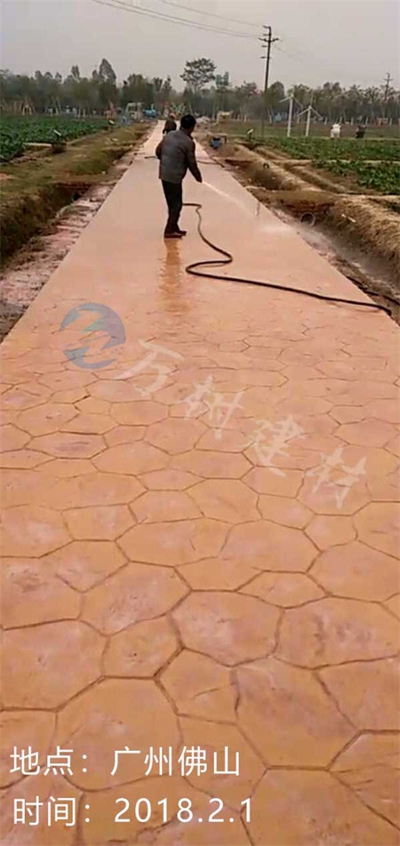 6,實(shí)現(xiàn)色彩交互:待封閉萬(wàn)樹(shù)彩色混凝土一至兩天硬化后,再使用洗衣粉或洗潔精將其表面的脫模粉沖洗,沖洗完畢的萬(wàn)樹(shù)壓模地坪表面乃留有15%左右的脫模粉,這些脫模粉大都分布在萬(wàn)樹(shù)壓模地坪陷入的部位,能增加彩色混凝土的立體感,層次感和色彩漸變。待彩色混凝土表面干透后,即使用萬(wàn)樹(shù)壓模地坪專(zhuān)用保護(hù)劑封閉彩色混凝土表面,使彩色混凝土出現(xiàn)天然石材的色澤和質(zhì)感,同時(shí)增強(qiáng)萬(wàn)樹(shù)壓模地坪防紫外線和防污染性能。